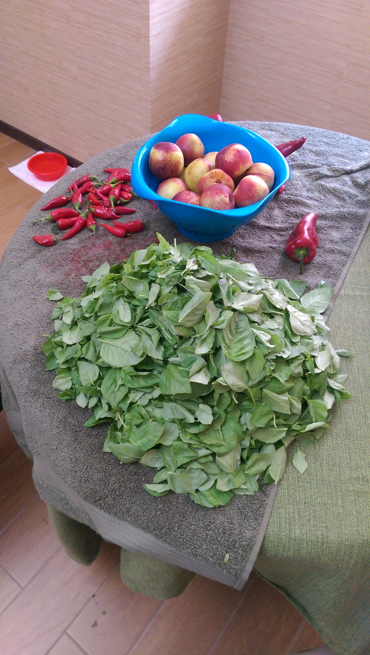 When we got home, we spent several hours in the kitchen, peeling, cutting and preparing the loot for the freezer so we could enjoy all this beauty when the winter comes. I must have pinched of the biggest mountain of basil leaves in my life so far and we both tasted the best nectarines ever.
